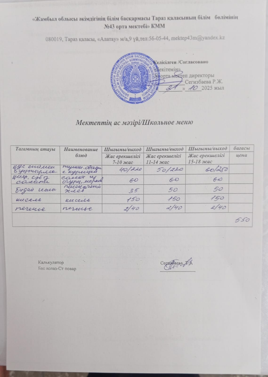 21.10.2025 ж тегін ыстық тамақтанатын білім алушылардың ас мәзірі. » 43 орта мектебі
