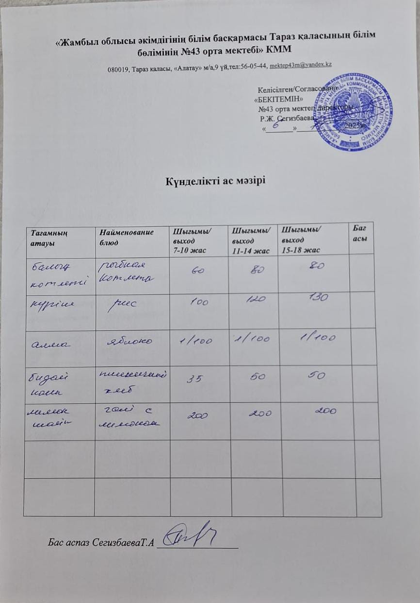 06.11.2025 ж тегін ыстық тамақтанатын білім алушылардың ас мәзірі. » 43 орта мектебі