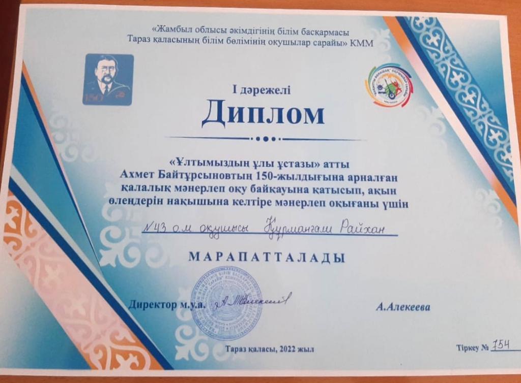 "Ұлтымыздың ұлы ұстазы" атты Ахмет Байтұрсыновтың 150-жылдығына арналған қалалық мәнерлеп оқу байқауына қатысып, ақын өлеңдерін нақышына келтіре мәнерлеп оқығаны үшін N 43 орта мектебінің 8 "А" сынып оқушысы Құрманғали Райхан I дәрежелі дипломмен марапатталды.