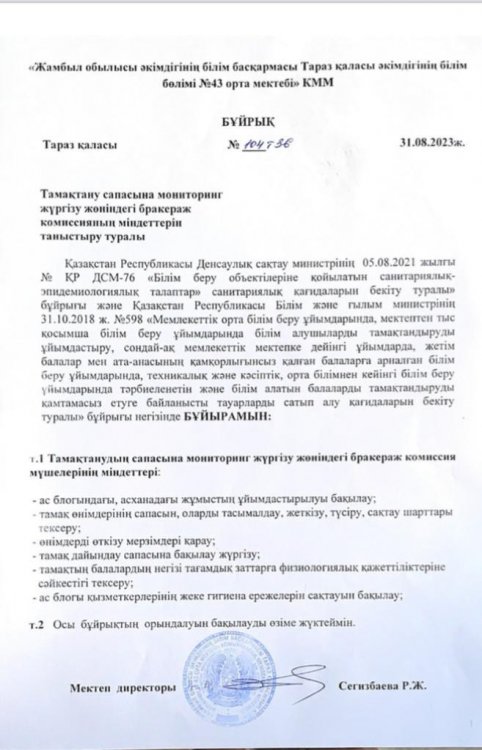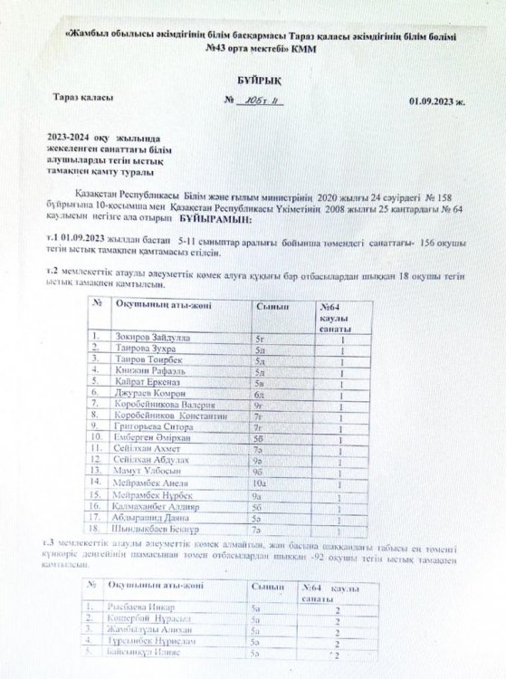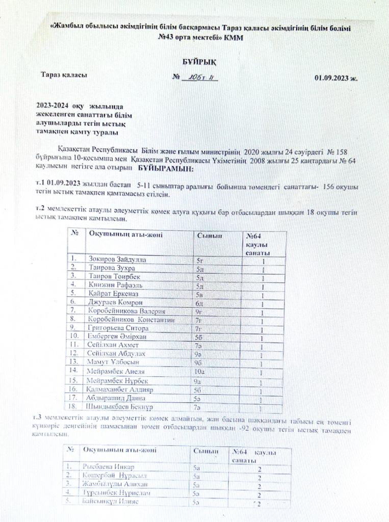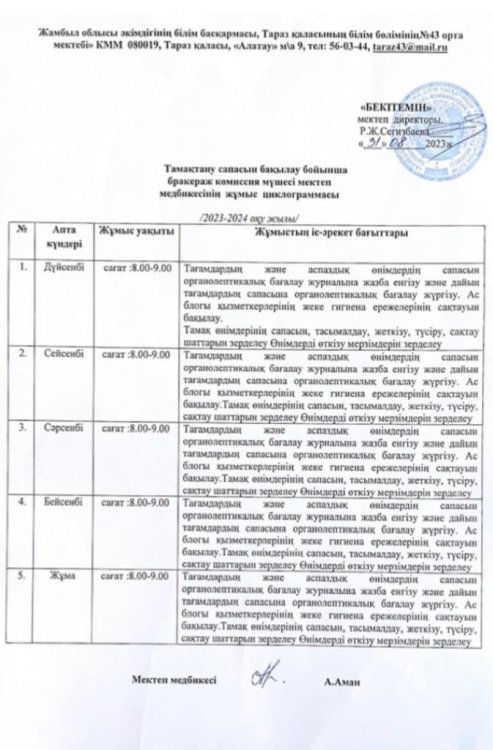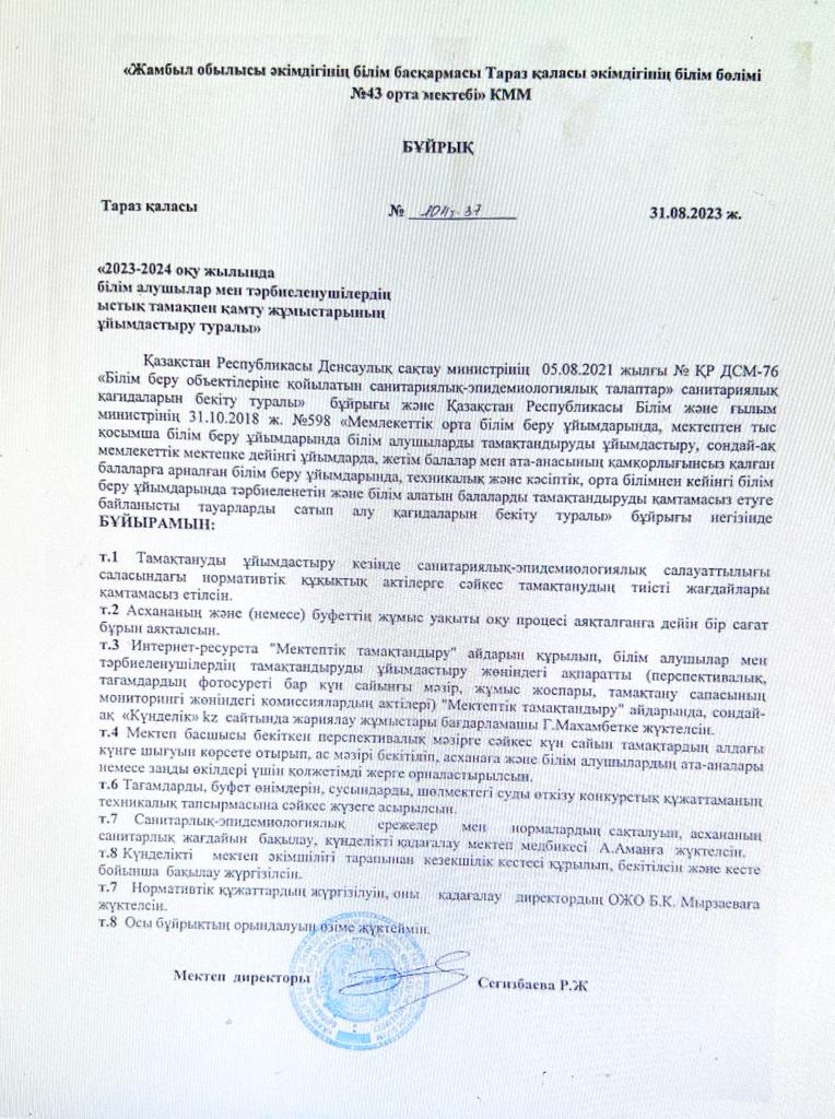 2023-2024 оқу жылында мектепте тамақтандыру ұйымдастыру жұмыстары » 43 орта мектебі