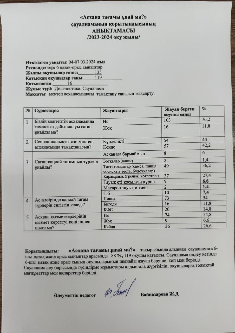 43 орта мектебі » Ақпарат » 04-14.03.2024 жылы 6-7 қазақ орыс сыныптар аралығында «Асхана тағамы ұнай ма?» тақырыбында жасырын сауалнама алынды. Мақсаты: мектеп асханасындағы та