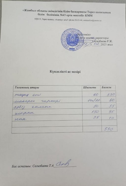 12 ақпан 2025 0 1 2 3 4 5 12.02.2025 ж тегін ыстық тамақтанатын білім алушылардың ас мәзірі. 12.02.2025 ж тегін ыстық тамақтанатын білім алушылардың ас мәзірі.