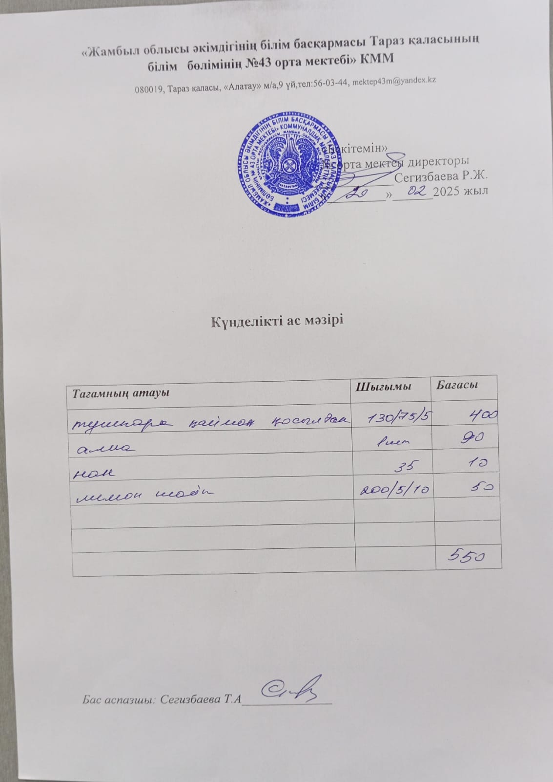 20 ақпан 2025 0 1 2 3 4 5 20.02.2025 ж тегін ыстық тамақтанатын білім алушылардың ас мәзірі. 20.02.2025 ж тегін ыстық тамақтанатын білім алушылардың ас мәзірі.