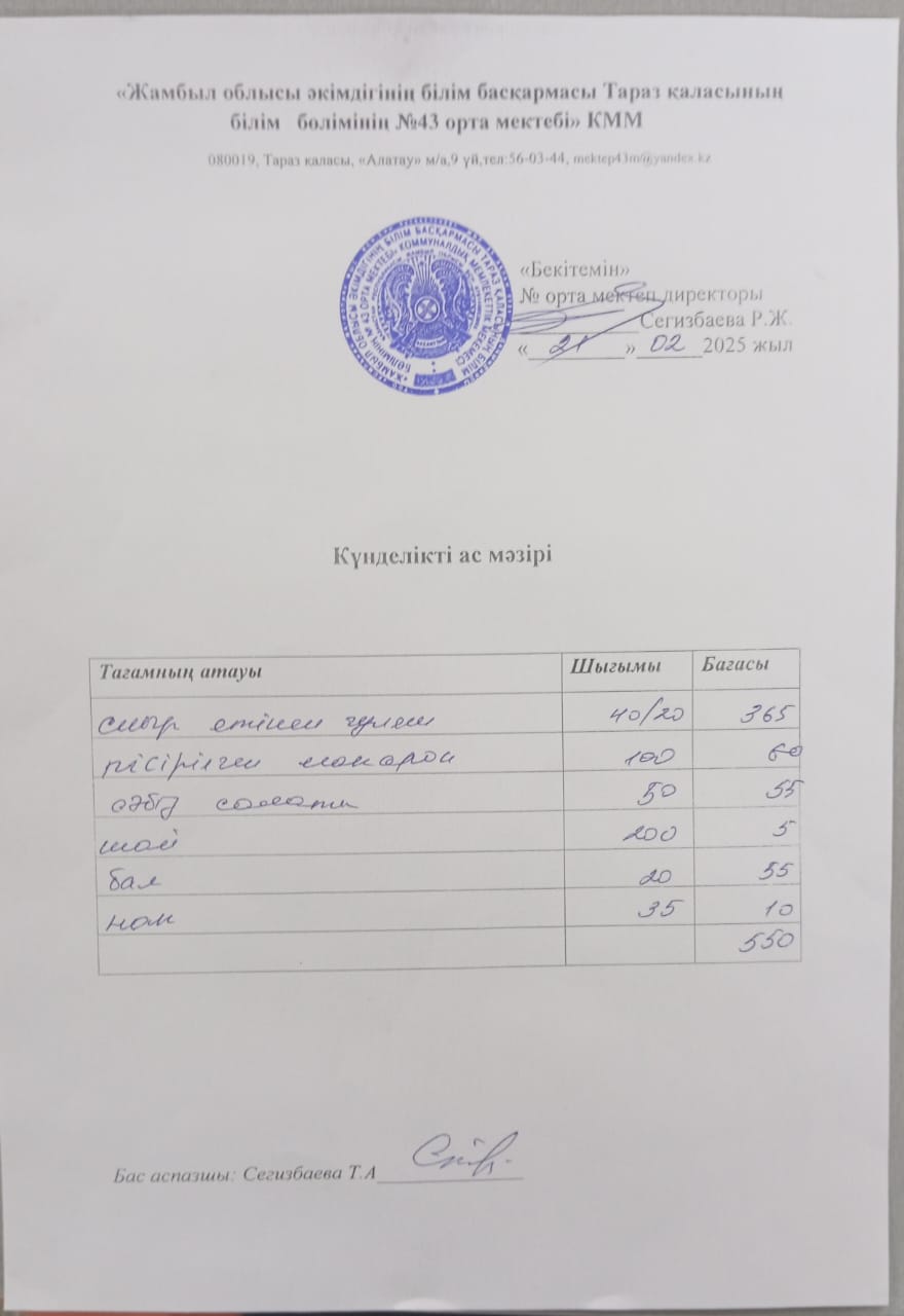 21 ақпан 2025 0 1 2 3 4 5 21.02.2025 ж тегін ыстық тамақтанатын білім алушылардың ас мәзірі. 21.02.2025 ж тегін ыстық тамақтанатын білім алушылардың ас мәзірі.