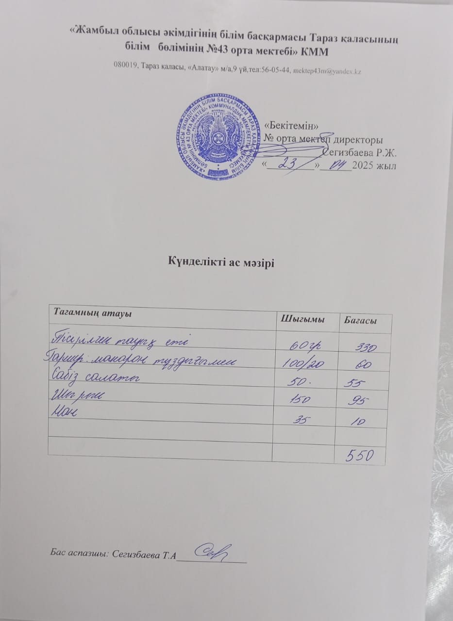 23 сәуір 2025 0 1 2 3 4 5 23.04.2025 ж тегін ыстық тамақтанатын білім алушылардың ас мәзірі. 23.04.2025 ж тегін ыстық тамақтанатын білім алушылардың ас мәзірі.