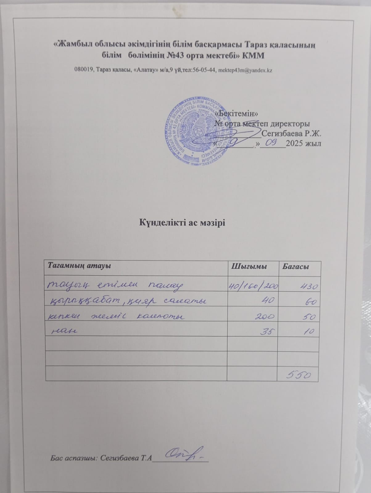 09.09.2025 ж тегін ыстық тамақтанатын білім алушылардың ас мәзірі. » 43 орта мектебі