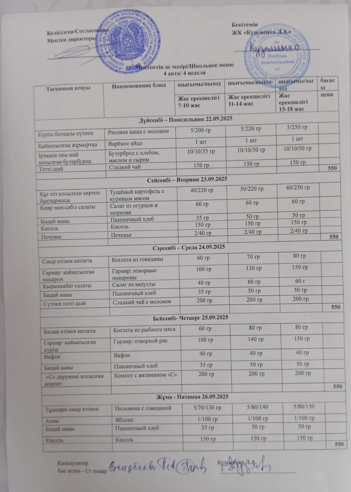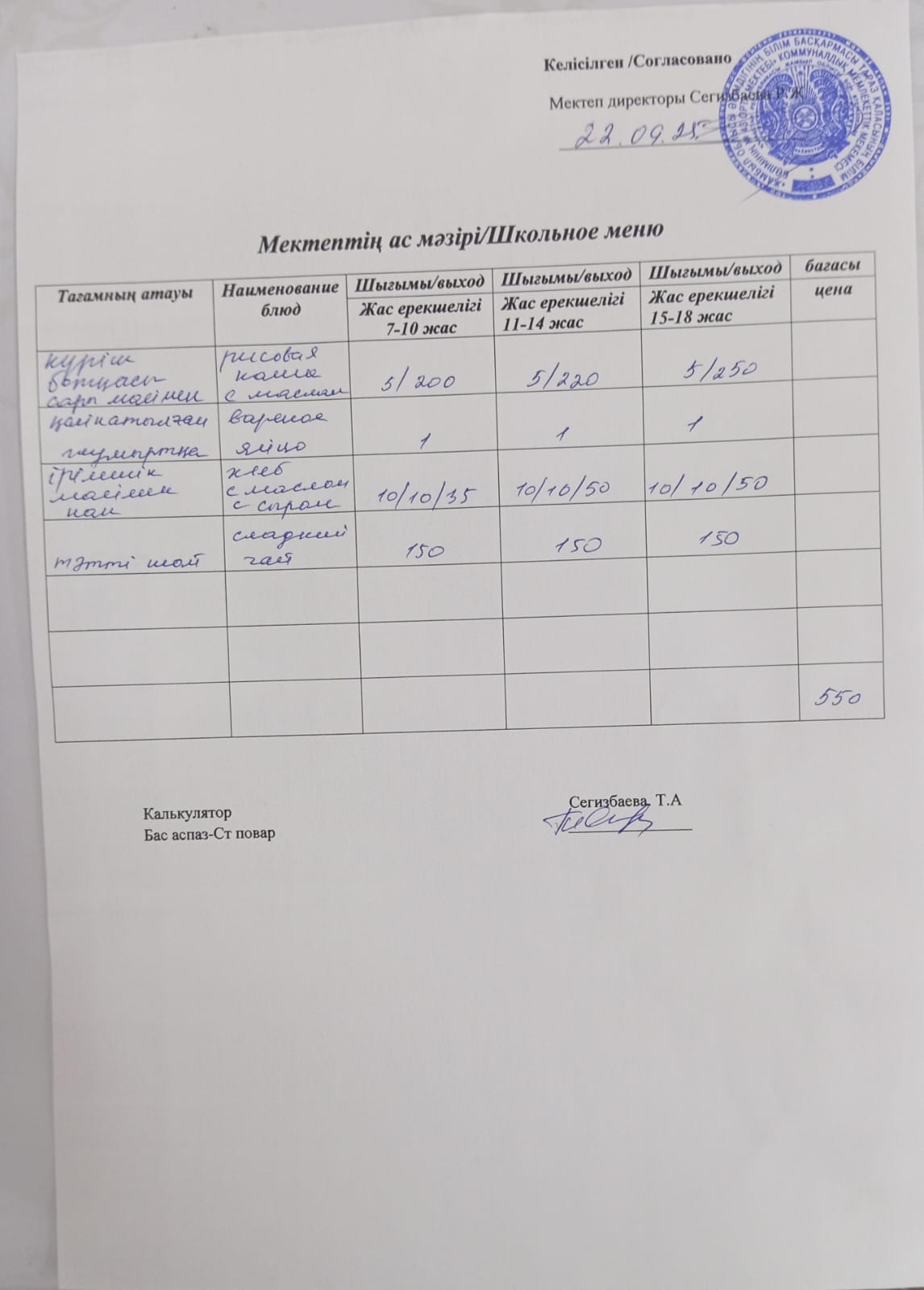 » » 22.09.2025 ж тегін ыстық тамақтанатын білім алушылардың ас мәзірі.