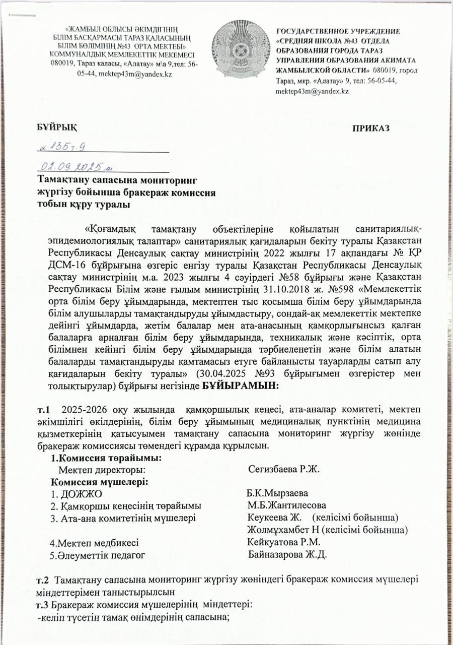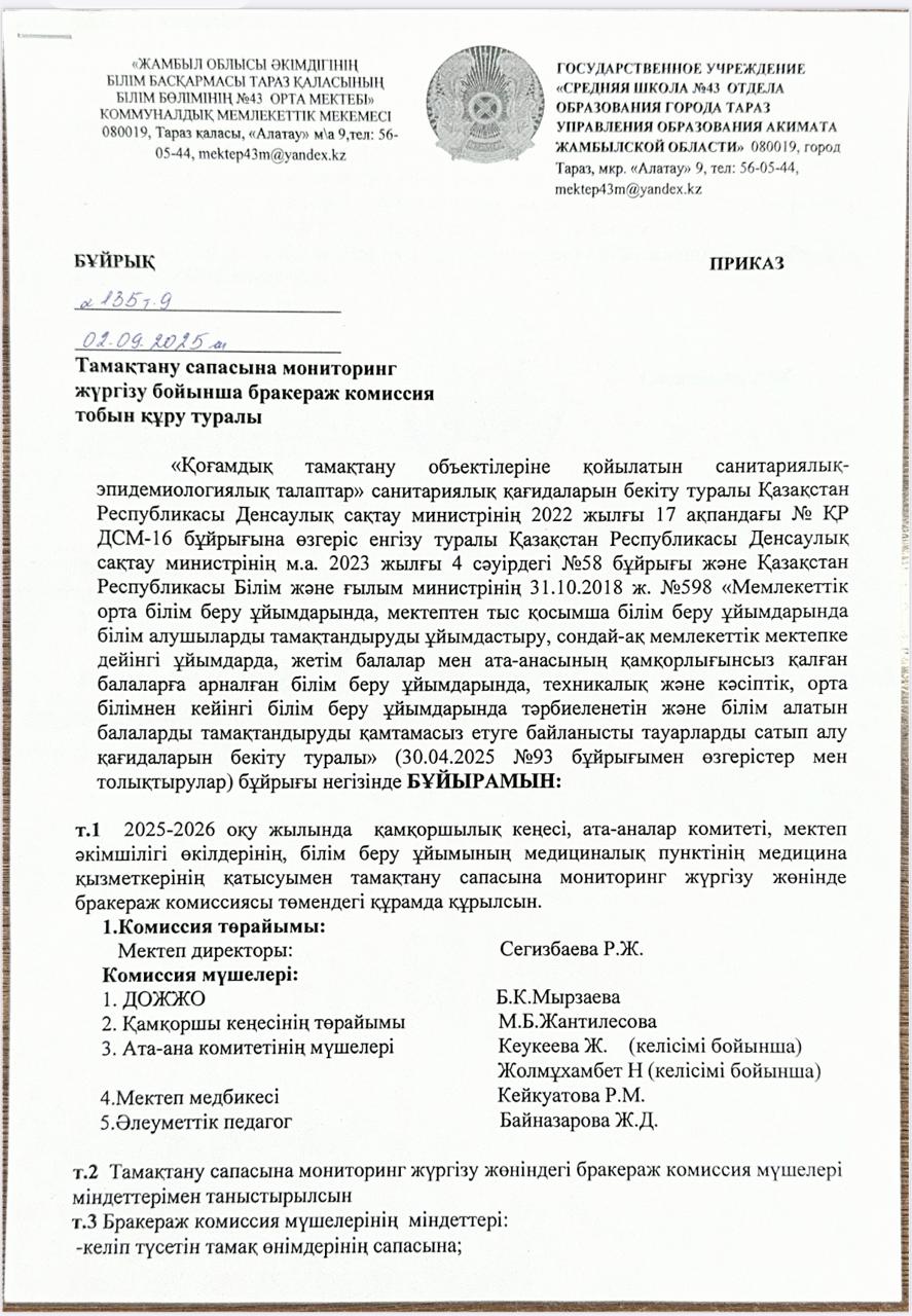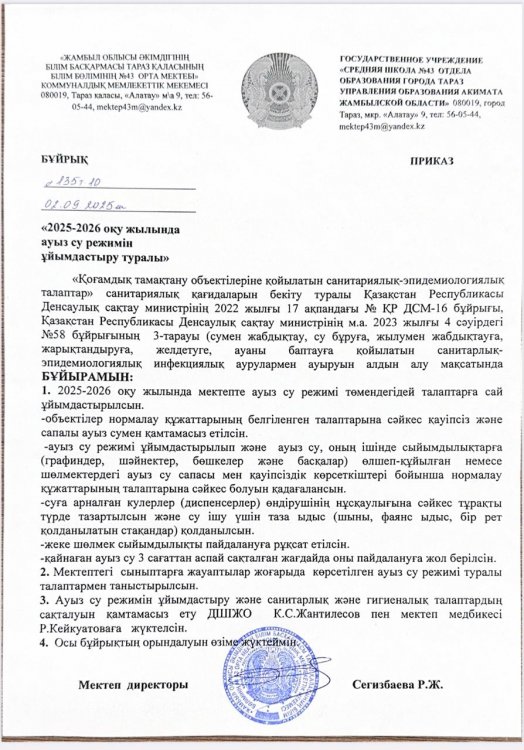02 қыркүйек 2025 0 1 2 3 4 5 «Салауатты Мектеп» жобасын дамыту және кеңейту жөнінде 2025-2026 оқу жылында ұйымдастыру жұмыстары (бұйрықтар) «Салауатты Мектеп» жобасын дамыту және кеңейту жөнінде 2025-2026 оқу жылында ұйымдастыру жұмыстары (бұйрықтар)