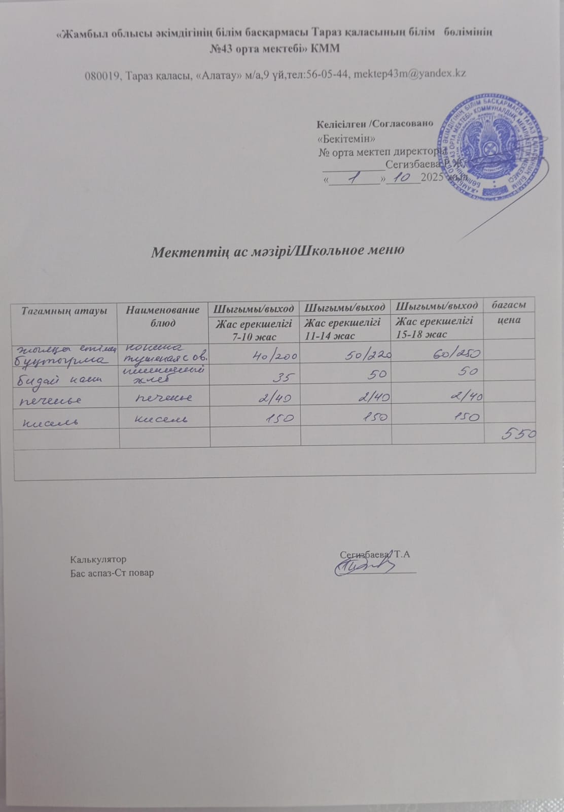01.10.2025 ж тегін ыстық тамақтанатын білім алушылардың ас мәзірі. » 43 орта мектебі