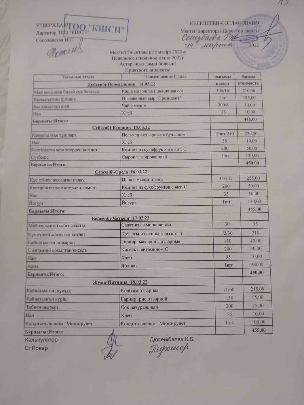 Мектептің апталық ас мәзірі 14.03.-18.03.2022
