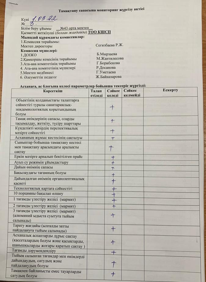 Тамақтану сапасына мониторинг жүргізу актісі » 43 орта мектебі