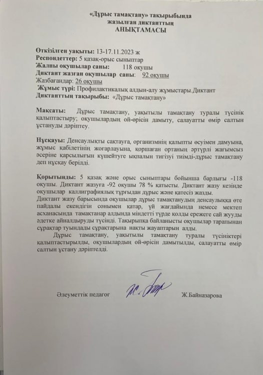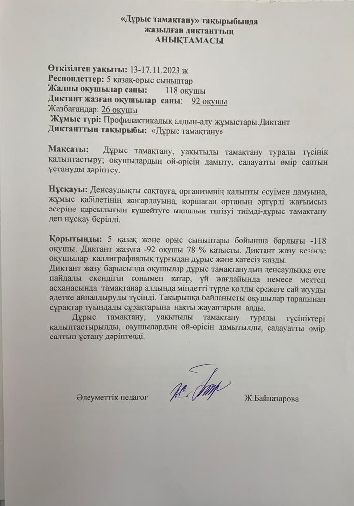 43 орта мектебі » Тамақтандыру » 13-17.11.2023 жылы Тараз қаласы, №43 орта мектепте 5- ші қазақ және орыс сыныптар аралығында “Дұрыс тамақтану” тақырыбында диктант алынды.