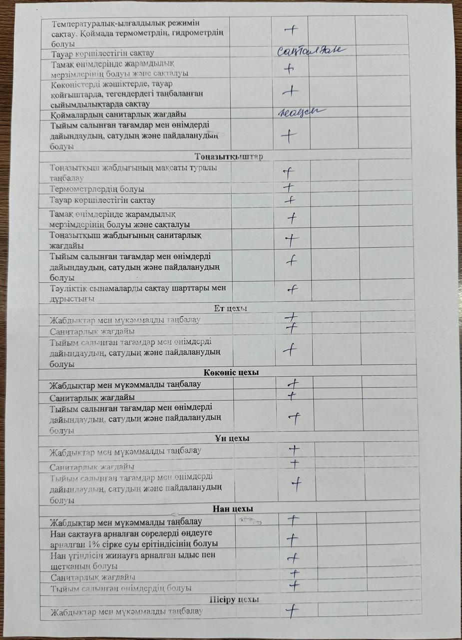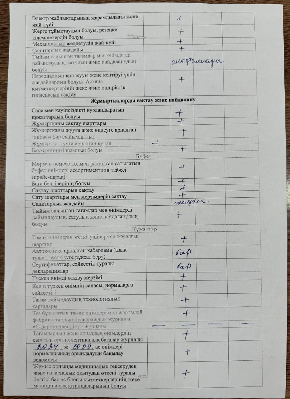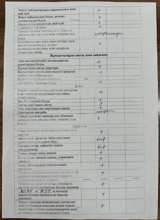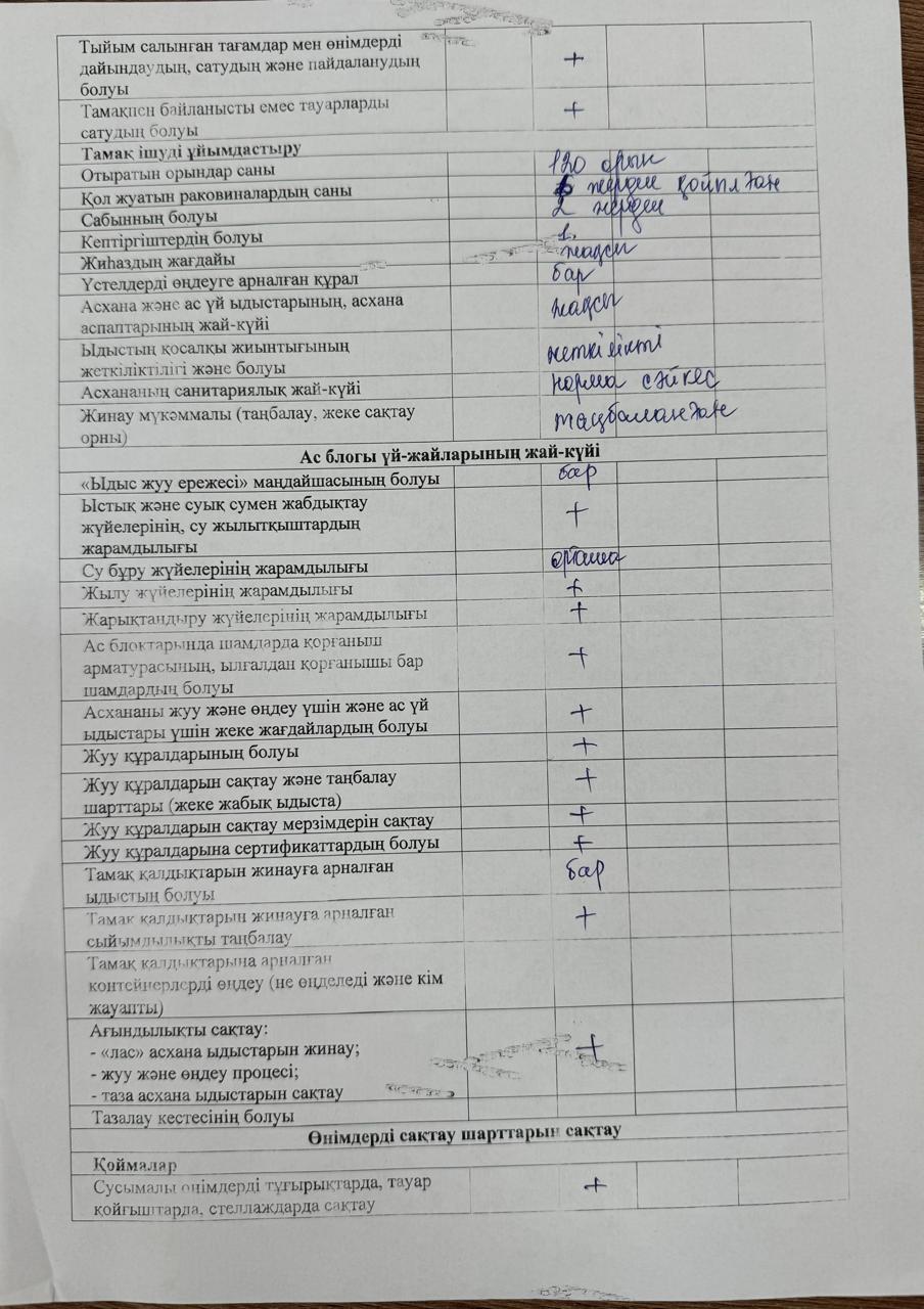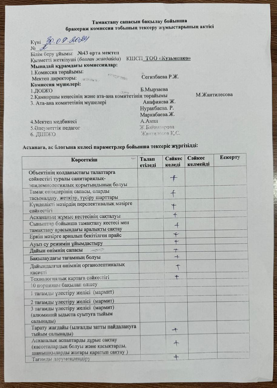 30.09.2024 жылы тамақтану сапасын бақылау бойынша бракераж комиссия мүшелері асхананың жалпы жұмысын, тауар көршілестігін, шикі өнімдердің сақталуын тексеріп, кемшіліктерді анықтап, АКТ толтырылды.