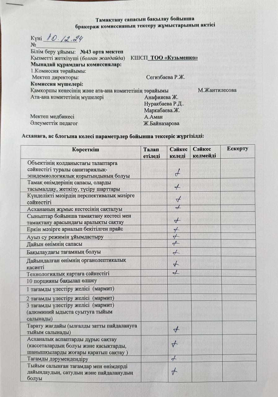 24.12.2024 жылы бракераж комиссиясы тамақтанудың сапасын бақылау бойынша жалпы асхананың жұмысын тексеріліп, Акт толтырылып, отырыс жасалып, хаттамал » 43 орта мектебі