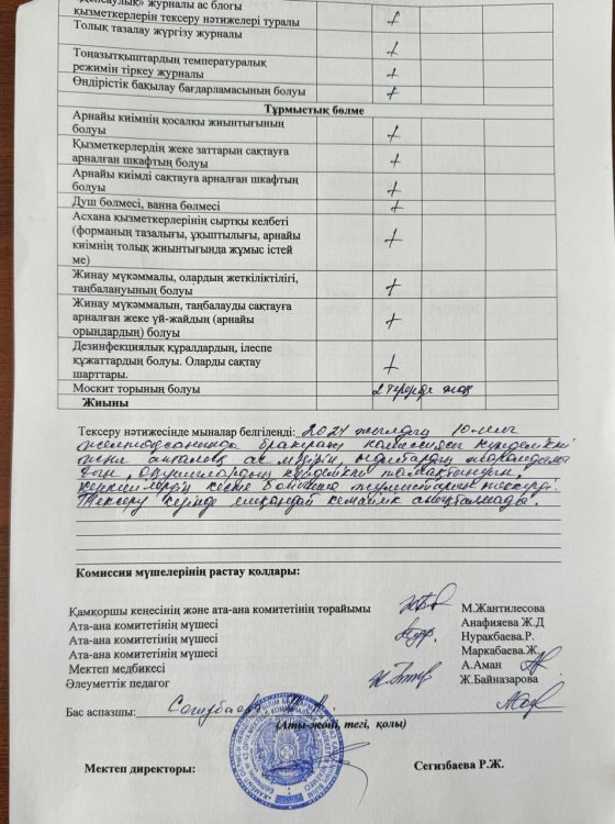 24.12.2024 жылы бракераж комиссиясы тамақтанудың сапасын бақылау бойынша жалпы асхананың жұмысын тексеріліп, Акт толтырылып, отырыс жасалып, хаттамаланды.