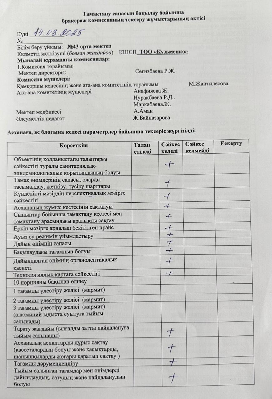 14.03..2025 жылы бракераж комиссиясы оқушылардың тамақтану сапасын бақылау бойынша жалпы асхананың жұмысын тексерілді. Тексерілген жұмыстарға Акт то » 43 орта мектебі