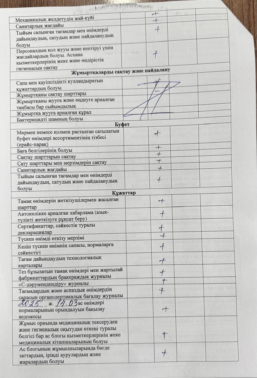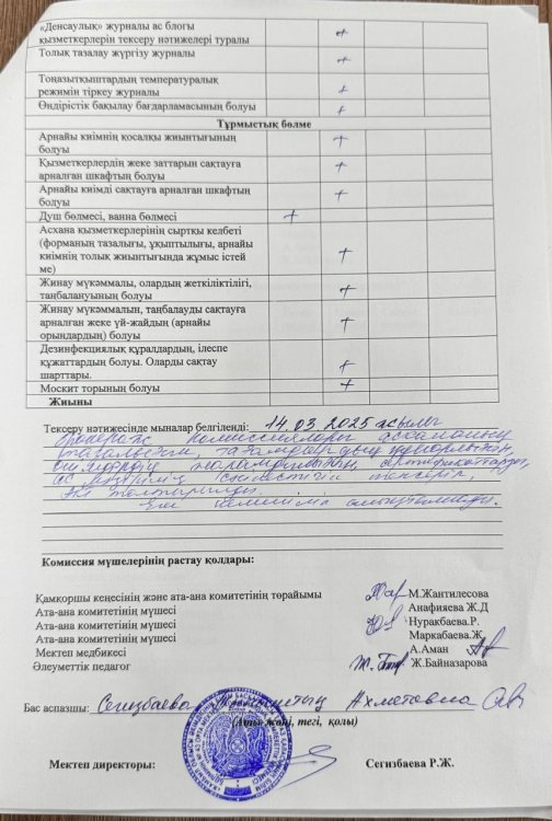14.03..2025 жылы бракераж комиссиясы оқушылардың тамақтану сапасын бақылау бойынша жалпы асхананың жұмысын тексерілді. Тексерілген жұмыстарға Акт то