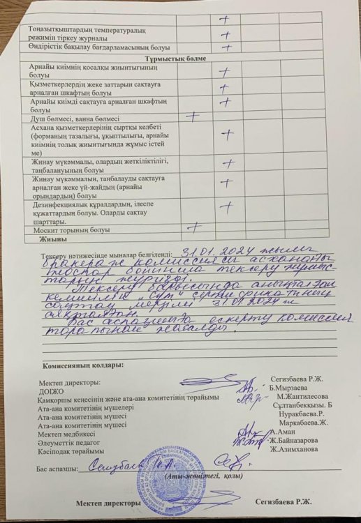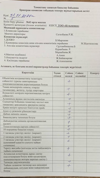 31 қаңтар 2024 0 1 2 3 4 5 31.01.2024 жылы бракераж комиссиясы жоспар бойынша асхананың жалпы жұмыстарын тексеріп, АКТ толтырылды.