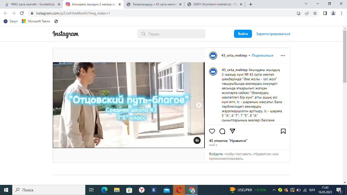 Ағымдағы жылдың 2 май күні № 43 орта мектеп шеңберінде "Әке жолы - ізгі жол" тақырыбында әкелердің онкүндігі аясында атқарылып жатқан жсопарға сәйкес "Әкелердің мектептегі бір күні" атты ашық есі күні өтті. Іс - шараның мақсаты: Бала тәрбиесіндегі әкелердің жауапкершілігін арттыру. Іс - шараға 5 "А", 6 "Г", 7 "Е", 8 "А" сыныптарының әкелері белсене қатысты.
