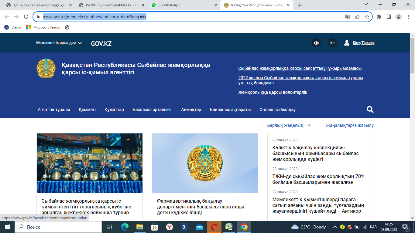 08 сентябрь 2023 0 1 2 3 4 5 ҚР Противодействие коррупции агенттігі сайтына сілтеме. https://www.gov.kz/memleket/entities/anticorruption?lang=kk