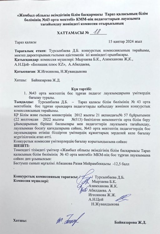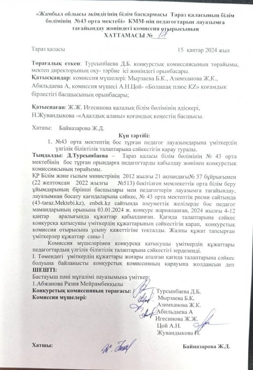 Бастауыш пәні мұғалімінің конкурсының Хаттамасы » 43 орта мектебі