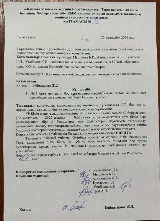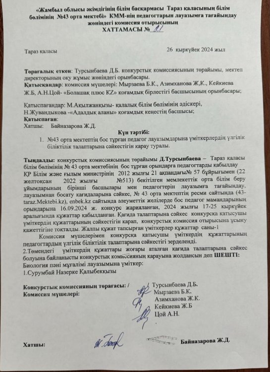 26 сентябрь 2024 0 1 2 3 4 5 Директордың құқық тәрбие ісі жөніндегі орынбасары мен биология пәні мұғалімін қабылдау конкурсының қорытындысы