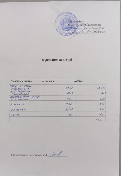 27 январь 2025 0 1 2 3 4 5 27.01.2025 ж тегін ыстық тамақтанатын білім алушылардың ас мәзірі. 27.01.2025 ж тегін ыстық тамақтанатын білім алушылардың ас мәзірі.