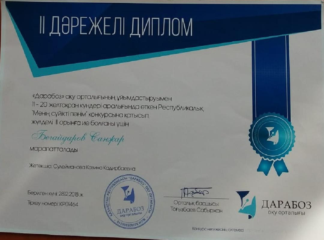 12 декабрь 2018 0 1 2 3 4 5 Дарабоз "Дарабоз" оқу орталығының ұйымдастырылуымен 11-20 декабрь күндері аралығында өткен Республикалық "Менің сүйікті пәнім" конкурсына қатысып жүлделі ІІ орынға ие болғаны үшін Бегайдаров Санжар марапатталады. ( жетекшісі Сулейманова Казина Кадирбаевна)