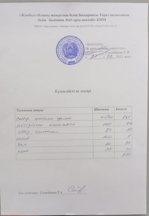 21 февраль 2025 0 1 2 3 4 5 21.02.2025 ж тегін ыстық тамақтанатын білім алушылардың ас мәзірі. 21.02.2025 ж тегін ыстық тамақтанатын білім алушылардың ас мәзірі.