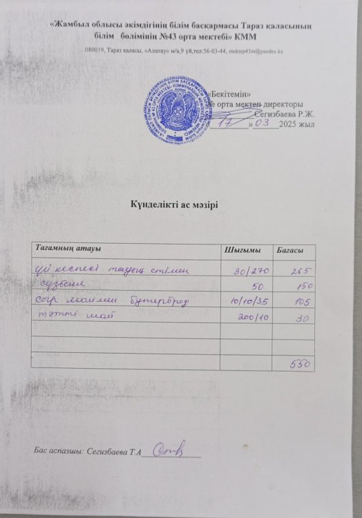 17 март 2025 0 1 2 3 4 5 17.03.2025 ж тегін ыстық тамақтанатын білім алушылардың ас мәзірі. 17.03.2025 ж тегін ыстық тамақтанатын білім алушылардың ас мәзірі.