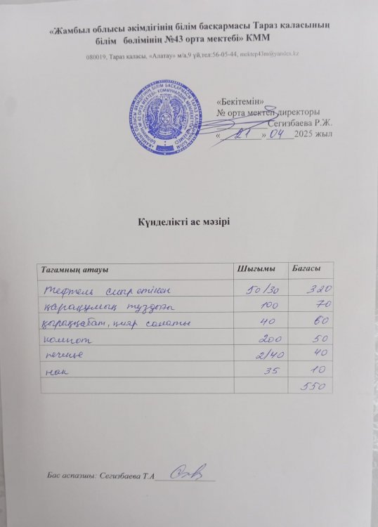21 сәуір 2025 0 1 2 3 4 5 21.04.2025 ж тегін ыстық тамақтанатын білім алушылардың ас мәзірі. 21.04.2025 ж тегін ыстық тамақтанатын білім алушылардың ас мәзірі.