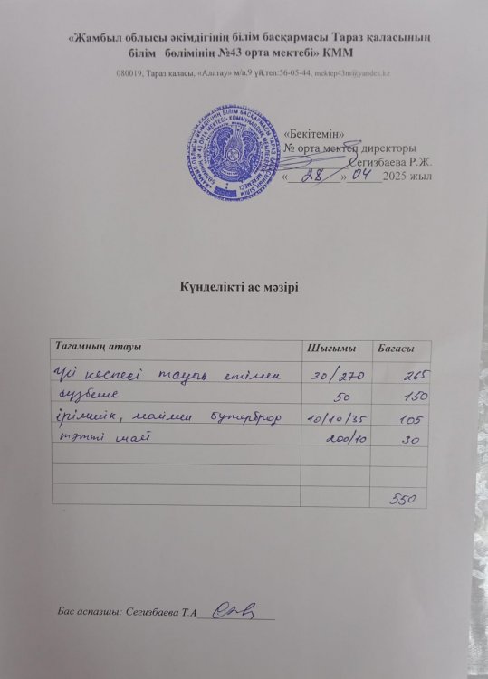 28.04.2025 ж тегін ыстық тамақтанатын білім алушылардың ас мәзірі. » 43 орта мектебі
