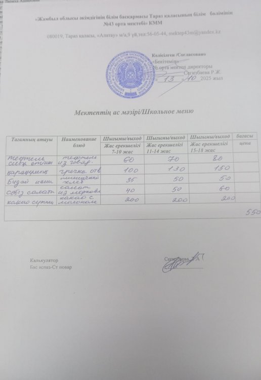 13.10.2025 ж тегін ыстық тамақтанатын білім алушылардың ас мәзірі. » 43 орта мектебі