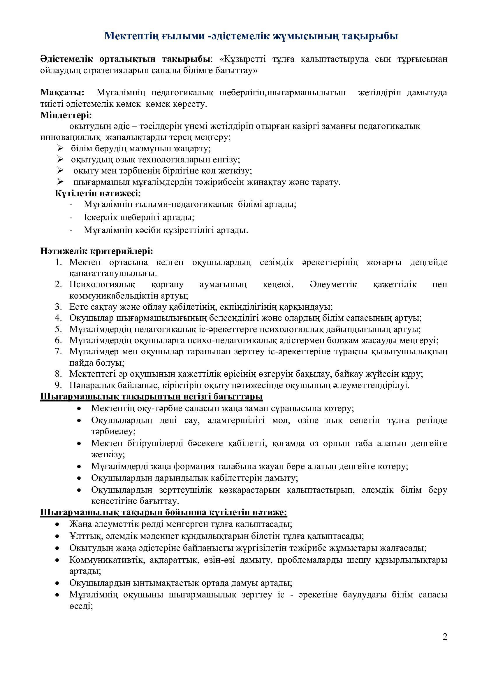 Әдістемелік орталықтың тақырыбы: «Құзыретті тұлға қалыптастыруда сын тұрғысынан ойлаудың стратегияларын сапалы білімге бағыттау»