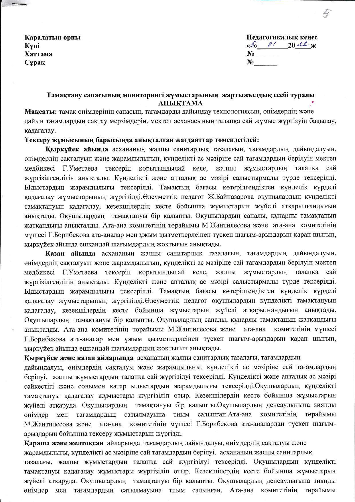 05 январь 2022 0 1 2 3 4 5 Тамақтану сапасының мониторингі жұмыстарының жартыжылдық есебі туралы анықтама