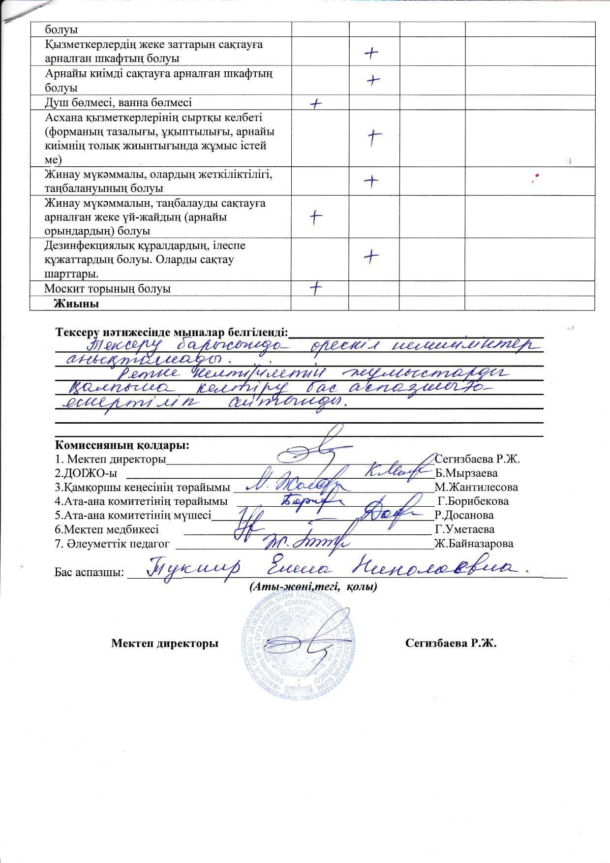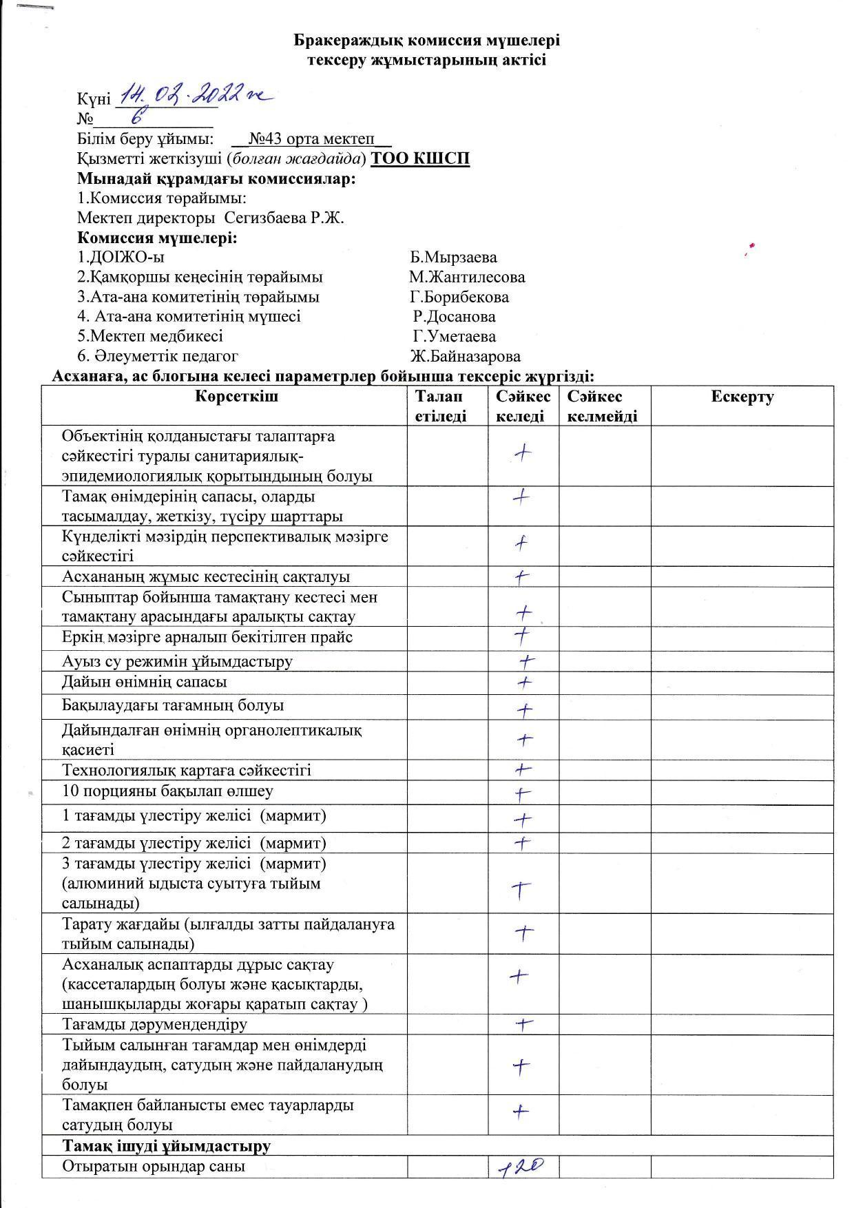 Бракераждық комиссия мүшелері тексеру жұмыстарының актісі. » 43 орта мектебі