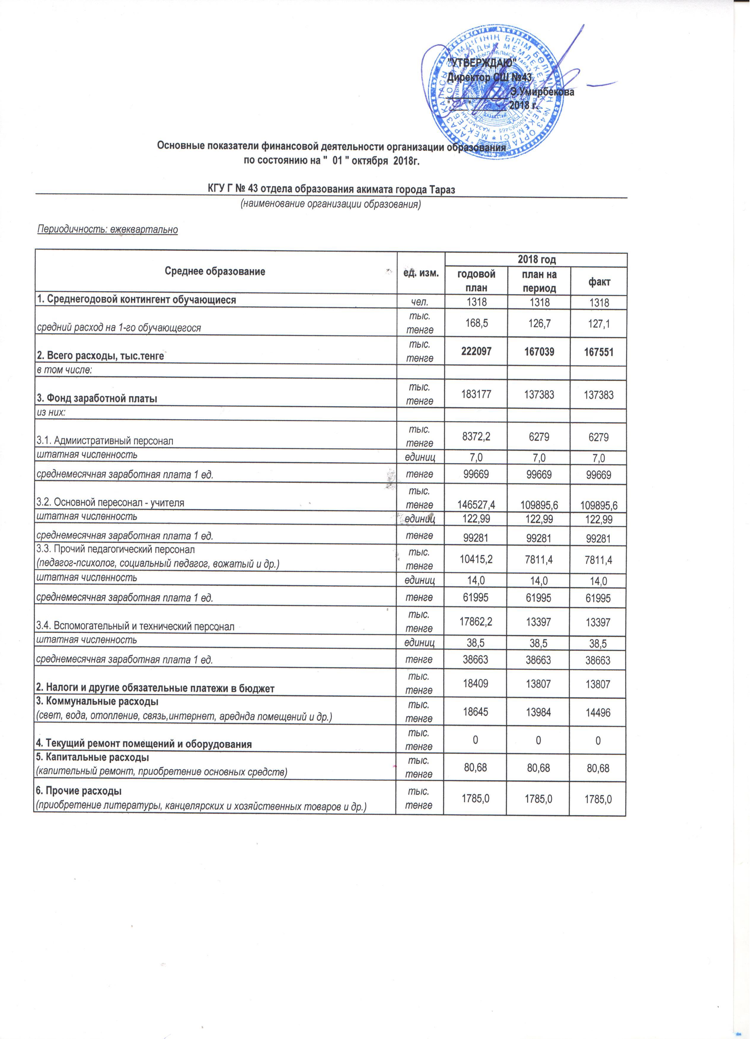 Қаржылық қызметтің негізгі көрсеткіші » 43 орта мектебі