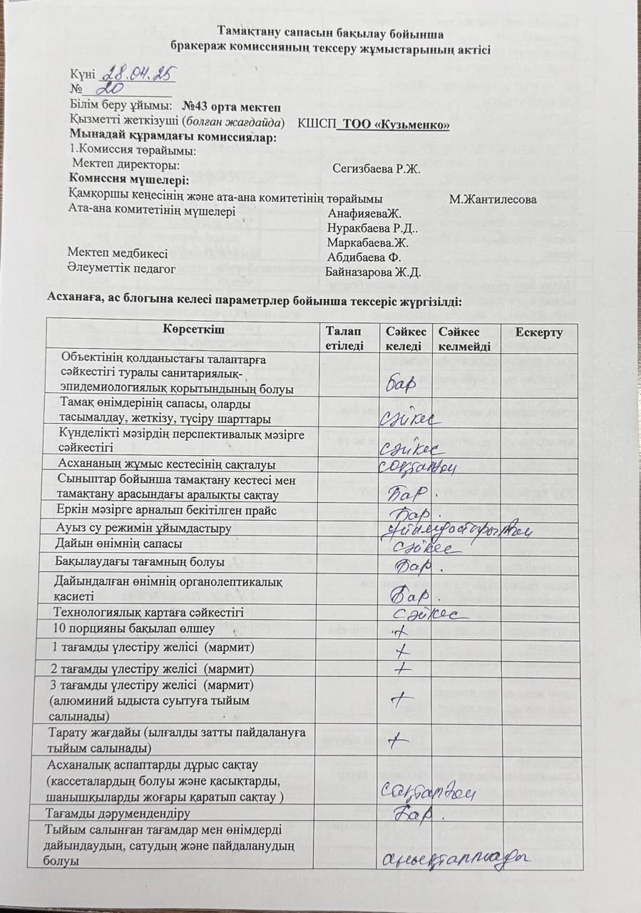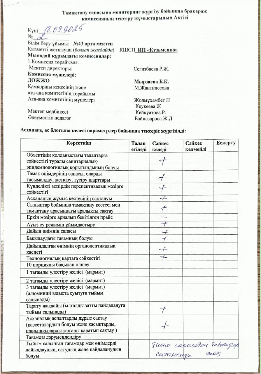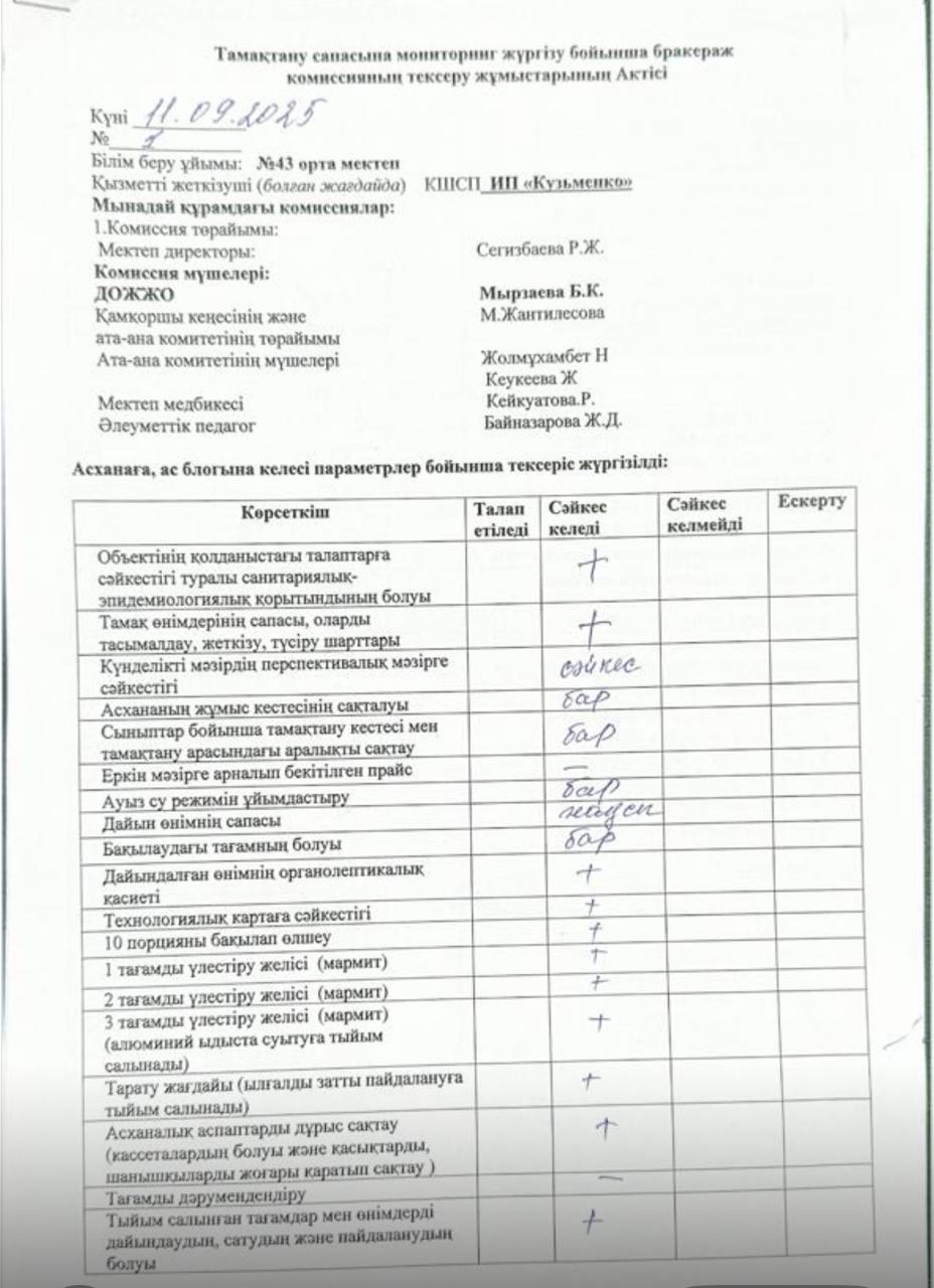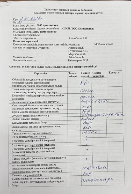03.10.2025 жылы тамақтану сапасына мониторинг жүргізу бойынша жалпы асхананың жұмысы тексерілді. Тексерілген жұмыстарға Акт толтырылып, қол қойылд https://43-taraz.mektebi.kz/pitanie/brokerazhdy-kommissija/1007-03102025-zhyly-tamatanu-sapasyna-monitoring-zhrgzu-bojynsha-zhalpy-ashanany-zhmysy-tekserld-tekserlgen-zhmystara-akt-toltyrylyp-ol-ojyld.html https://43-taraz.mektebi.kz/pitanie/brokerazhdy-kommissija/1007-03102025-zhyly-tamatanu-sapasyna-monitoring-zhrgzu-bojynsha-zhalpy-ashanany-zhmysy-tekserld-tekserlgen-zhmystara-akt-toltyrylyp-ol-ojyld.html